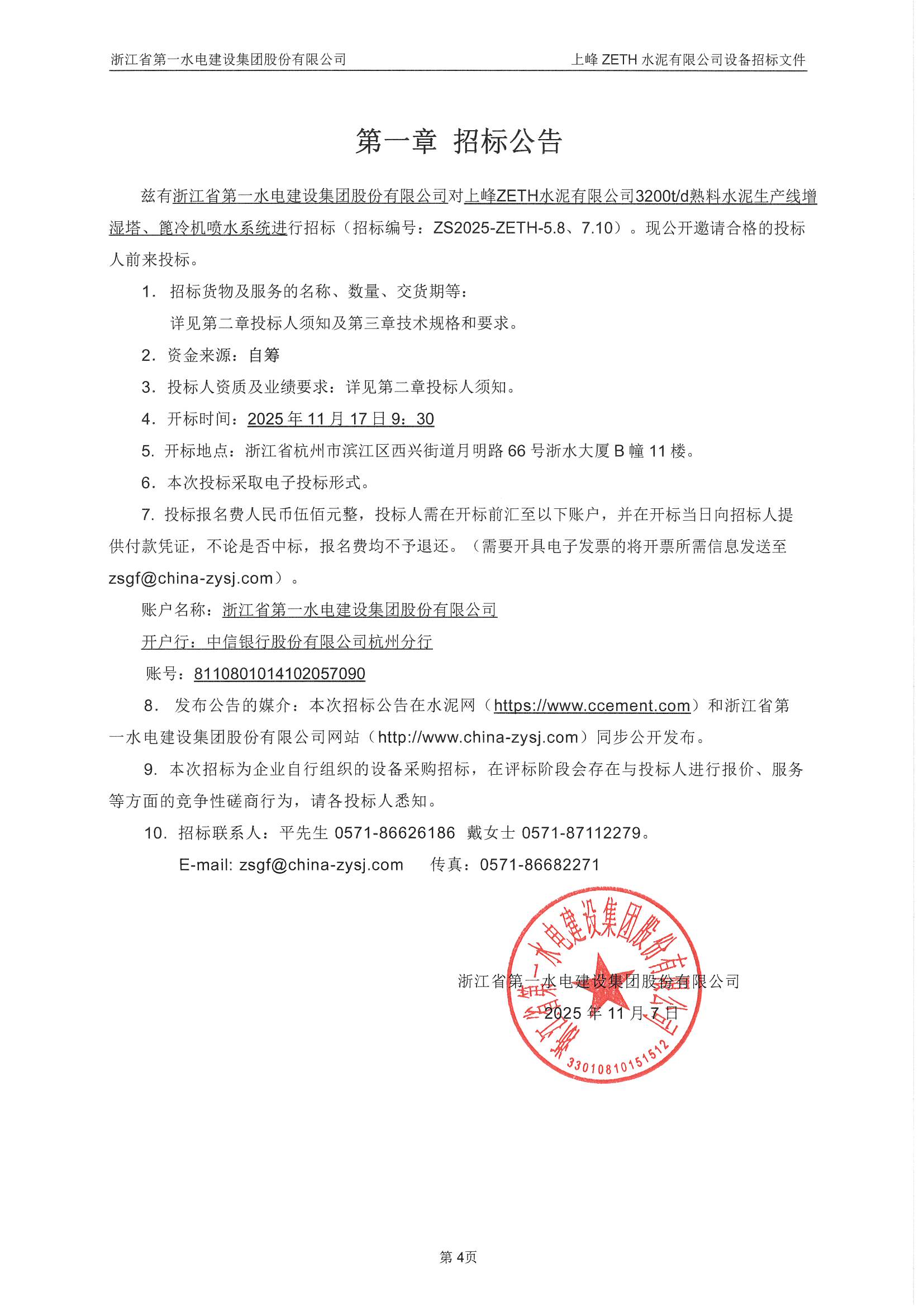 上峰ZETH水泥有限公司3200t/d熟料水泥生產線增濕塔、篦冷機噴水系統招標公告